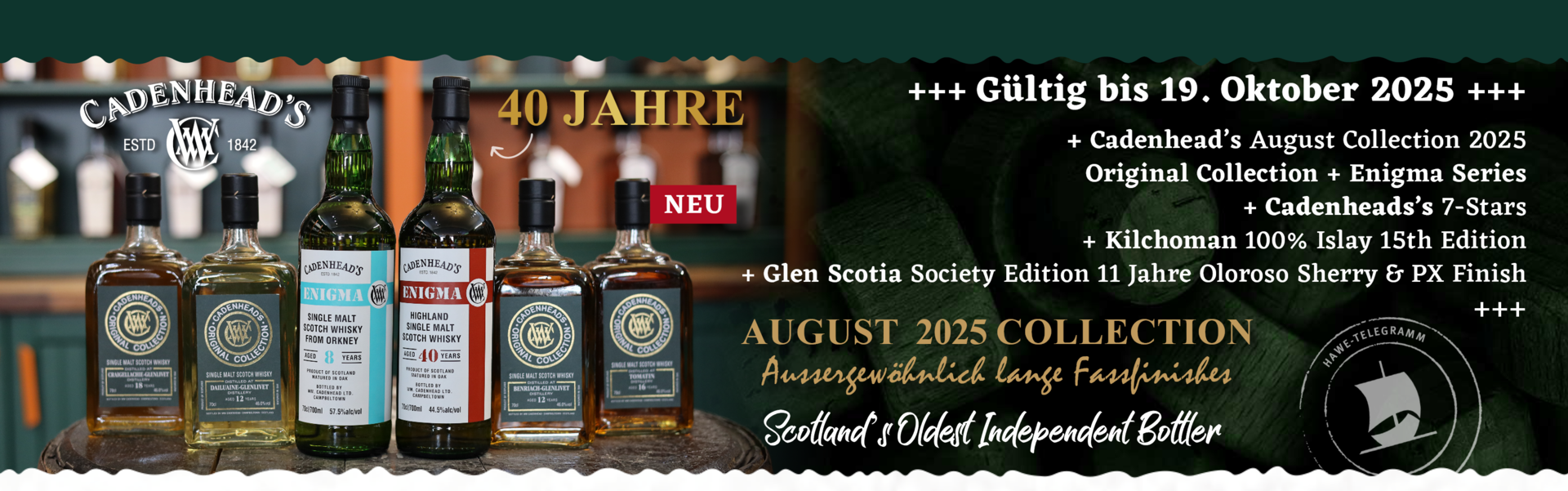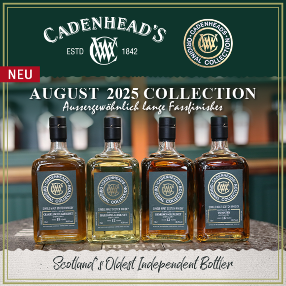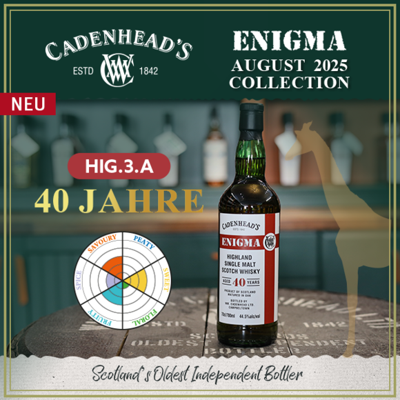 Entdecken Sie die außergewöhnlichen langen Fassfinishes der neuen Cadenhead's August Collection 2025. Die neue Kollektion präsentiert einzigartige Qualitäten und lange Fassfinishes berühmter Brennereien, darunter ein Tomatin 16 Jahre mit einem 5-jährigen Manzanilla Finish & der Benriach-Glenlivet 12 Jahre, der für 3 Jahre intensiv in Amontillado Fässern veredelt wurde. Eine absolute Rarität der Kollektion: Der Highland Enigma 40 Jahre, HIG.3.A mit einer Vollreifung in Bourbon Hogsheads. Welche Destillerie sich genau hinter dem Single Malt versteckt, bleibt ungewiss. Womöglich erinnern die Brennblasen der Brennerei an giraffenartig hohe Stills...