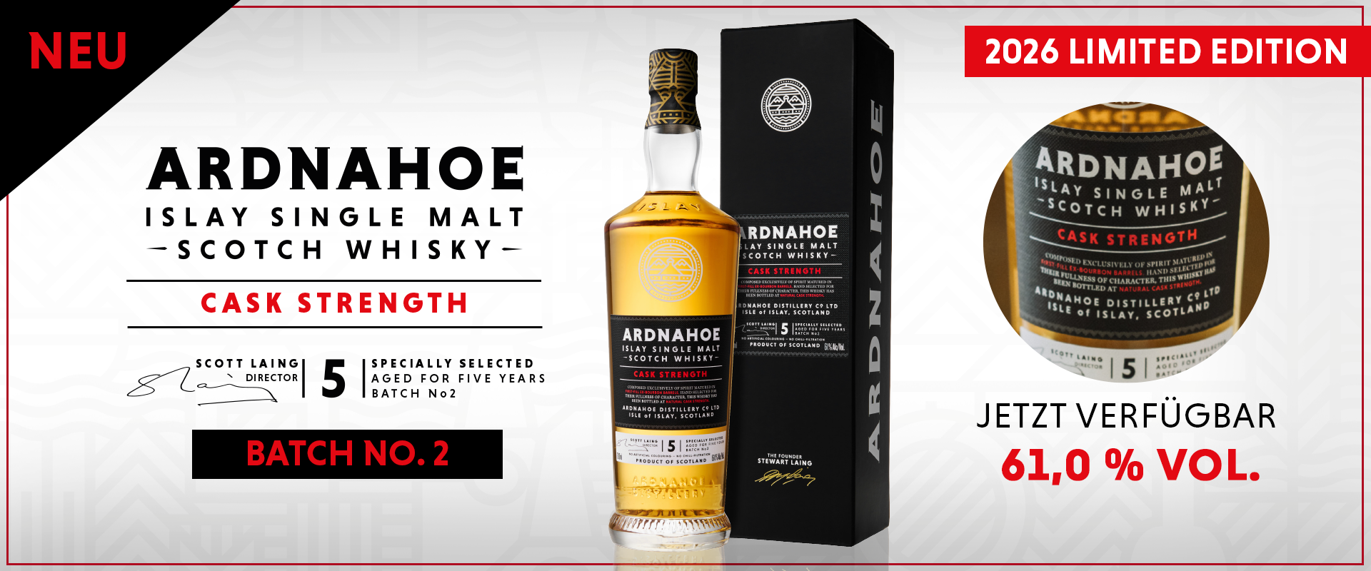 Nach dem besonders erfolgreichen Start der ersten Fassstarken Edition der Islay Brennerei Ardnahoe, stellen wir mit großer Freude Ardnahoe Cask Strength Edition – Batch No. 2 2026 vor. Durch den hohen Andrang und der strengen Limitierung des ersten Batchs präsentieren wir nun Batch No. 2. Die neuste Edition reifte für 5 Jahre in Bourbon Barrels und wurde anschließend in natürlicher Fassstärke bei 61,0 % Vol. abgefüllt. Die Fassstarke Edition präsentiert sich mit einer zusätzlichen Intensität und Tiefe und kreiert einen kraftvollen Islay-Stil.