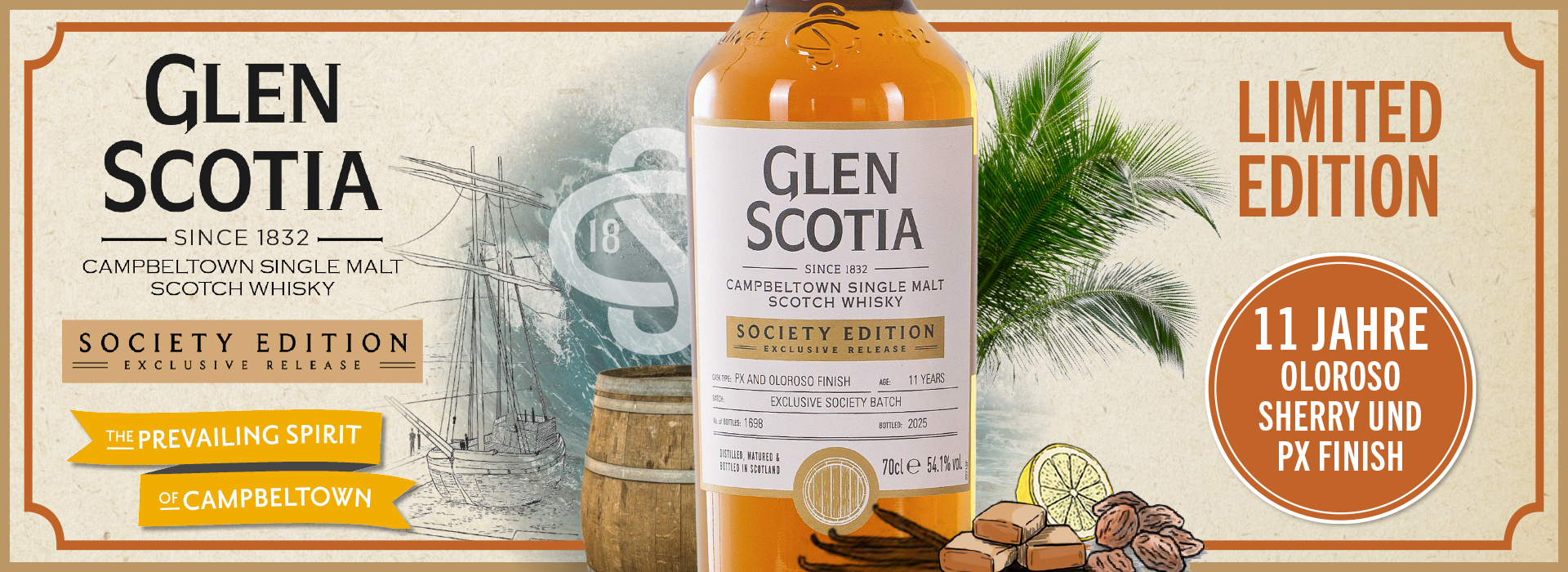 Gemeinsam mit der Glen Scotia Distillery präsentieren wir: Glen Scotia 11 Jahre Society Edition PX & Oloroso Sherry Finish – eine Fachhandels Exklusivedition, mit einer besonderen Vermählung von separiert gereiften Oloroso-Sherry- und Pedro Ximénez-Fässern, streng limitiert auf 1698 Flaschen. Auch die Kilchoman Distillery beeindruckt mit einem neuen Release aus ihrer beliebten 100% Islay Serie & stellt den Kilchoman 100% Islay The 15th Edition Bourbon Matured vor.