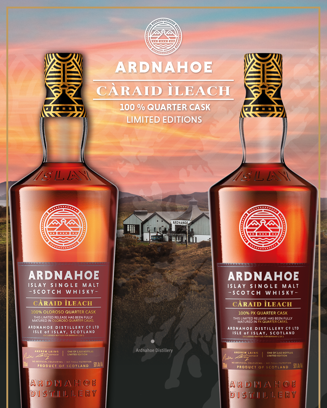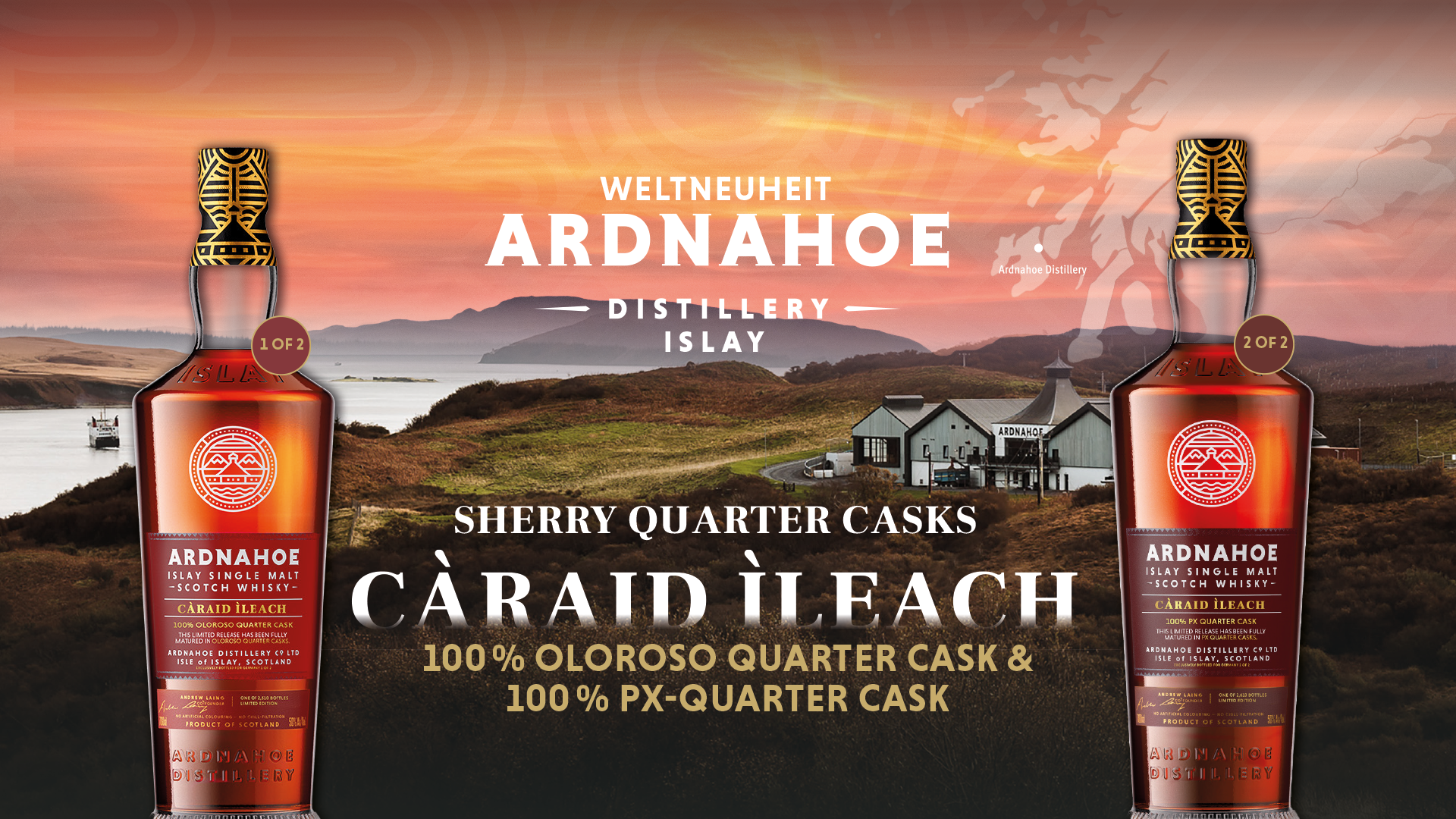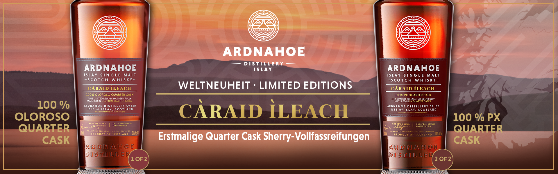 Gemeinsam mit der Islay Destillerie Ardnahoe präsentieren wir erstmalige Quarter Cask Sherry-Vollfassreifungen: „Ardnahoe Càraid Ileach“. Mit Ardnahoe Càraid Ileach erscheint das limitiertes Sherry Paar mit zwei Limited Editions: