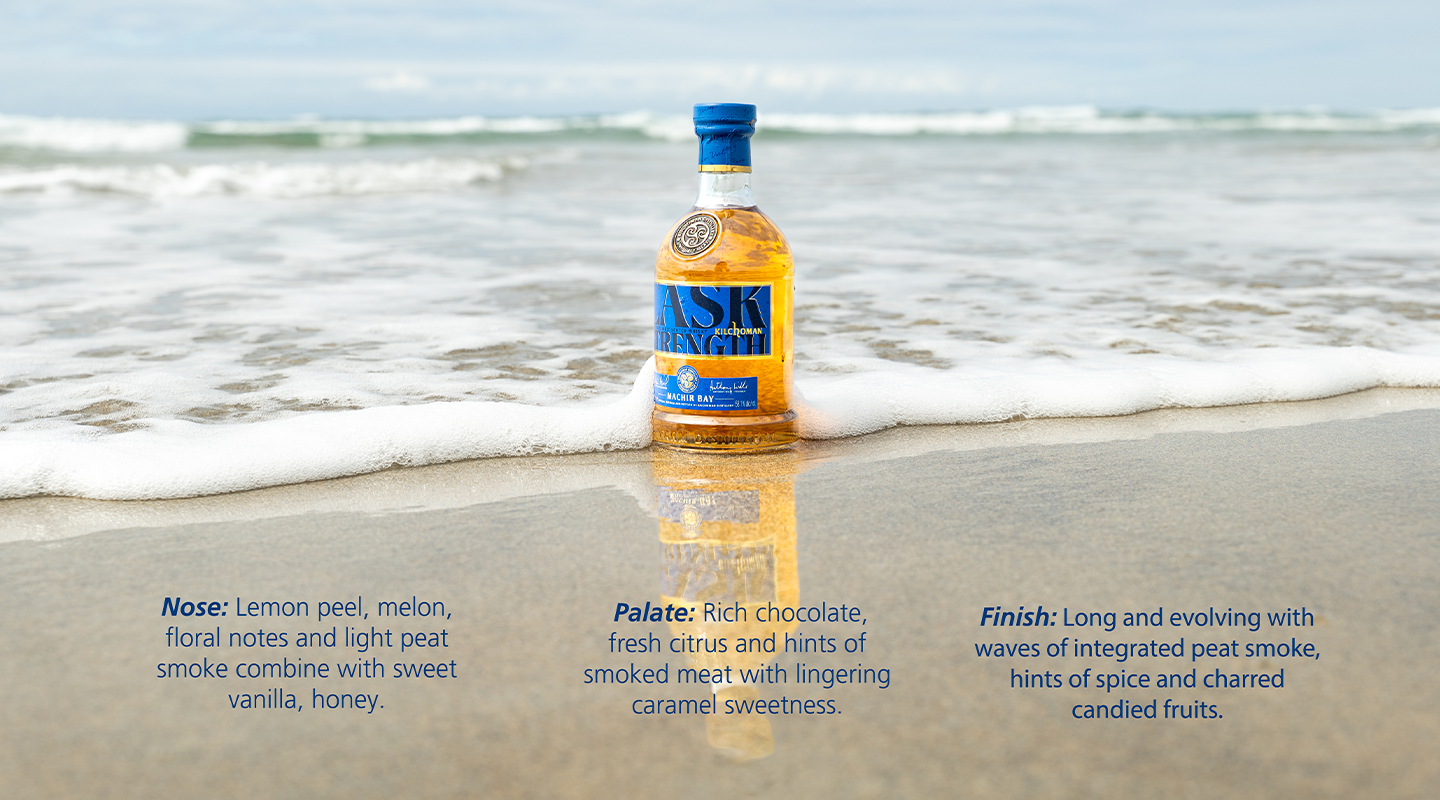 Der Single Malt wurde in natürlicher Fassstärke mit 58,1 % Vol. abgefüllt und präsentiert kräftige Rauchnoten, die mit den typischen Kilchoman Zitrusaromen und starkem Islay-Rauch harmonieren. Durch den kräftigen Torfeinfluss bietet der Machir Bay Cask Strength einen langanhaltenden und intensiven Abgang. Der Machir Bay Cask Strength wurde bei der „Ultimate Spirits Challenge 2021“ als „Best Islay Single Malt“ gekürt und erreichte eine herausragende Punktzahl von 99 Punkten.